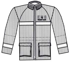 製式 | たて襟式のハーフコート型とし、ふた付きポケットを前面下部左右に各1個、胸部左に1個つける。左胸部に「EMS FIRE DEPT.YUBARI」の文字を入れ、背部には「EMS EMERGENCY SERVICE UNIT FIRE DEPT.YUBARI」の文字を入れる。胸部、背部及び前腕部に反射材をつける。形状は、図のとおりとする。 | ||